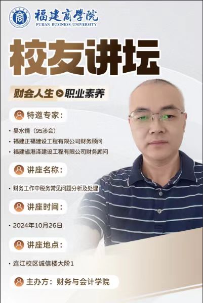 2024年10月26日,95涉外会计的吴水情校友为我院学生开设了题为《财务工作中税务常见问题分析及处理》的讲座。