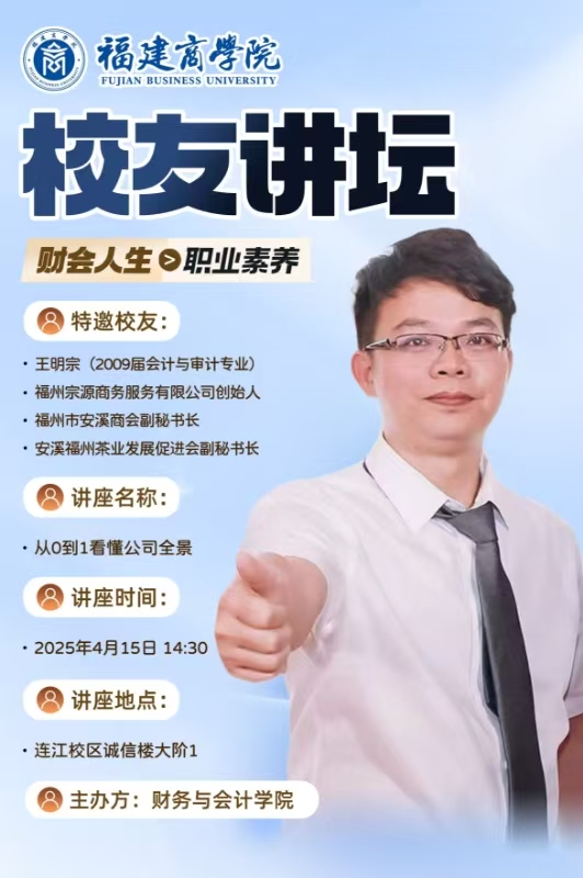 2025年4月15日,09会计与审计专业的王明宗校友为我院学生开设了题为《从0到1看懂公司全景》的讲座。