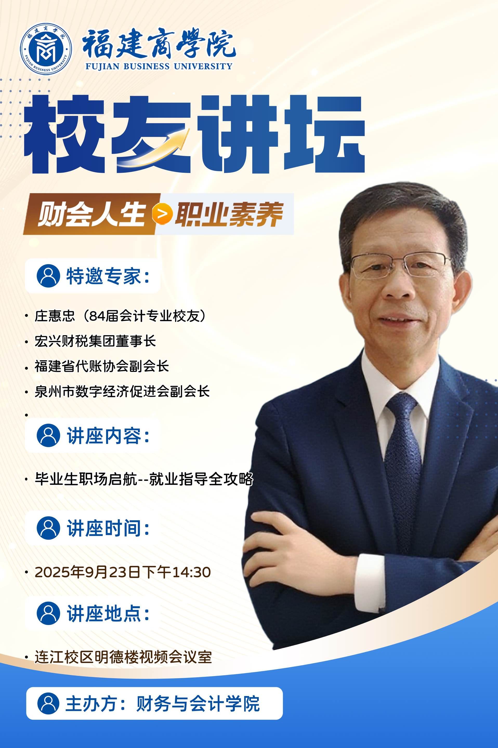 2025年9月23日,84届会计专业的庄惠忠校友为我院学生开设了题为《毕业生职场启航--就业指导全攻略》的讲座。