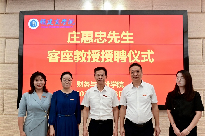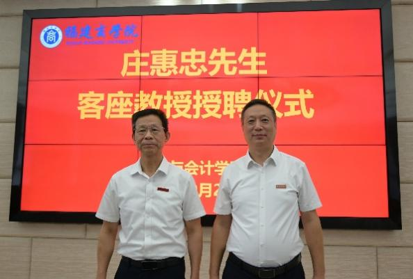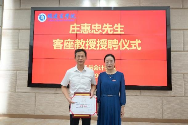 9月23日,太阳成集团tyc122ccvip举行客座教授授聘仪式,聘任1984届会计专业杰出校友、宏兴财税集团董事长庄惠忠先生为学院客座教授,随后,庄惠忠先生以“财会人生·职业素养——毕业生职场启航就业指导全攻略”为题开讲。仪式由学院党委副书记王艳主持,党委书记毛茂山、院长梁小红出席并颁发聘书、佩戴校徽,100余名学生代表参加活动。