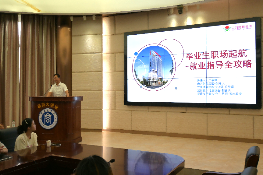 庄惠忠先生围绕数字化背景下财会行业趋势、复合型人才培养、毕业生求职策略等内容作专题报告。他结合宏兴财税集团26年服务5000余家企业的实践数据指出,数字化财税岗位需求持续增长,传统核算岗位占比逐年下降,“懂财务、会工具、能分析”的复合型人才更受市场青睐。庄惠忠勉励在场学子打破“重核算、轻管理”的思维定式,主动学习数据分析、管理会计等技能,并向“业财融合”方向转型。